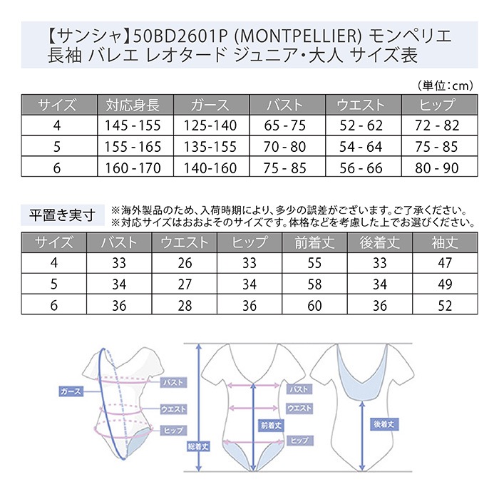 【サンシャ】50BD2601P (MONTPELLIER) モンペリエ 長袖 バレエ レオタード ジュニア・大人 |