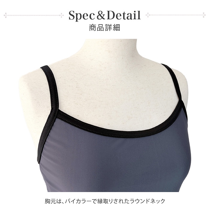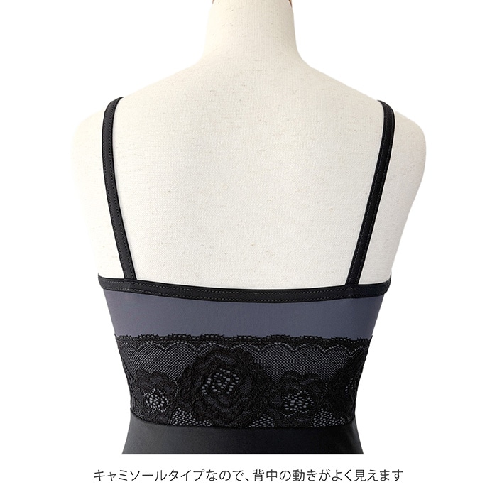 落ち着いた色合いで、キャミソールの紐部分と胸元のパイピングの黒が締め色となり、肌を綺麗に演出します。