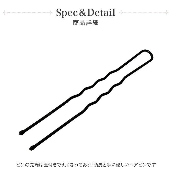 抜けにくい波型で、ピンの先端は丸くなっている玉付きなので頭皮と手に優しいヘアピンです。