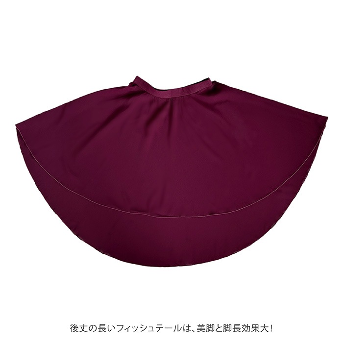 後丈の長いフィッシュテールは、身体の縦ラインを強調するシルエットなので、脚長効果大。