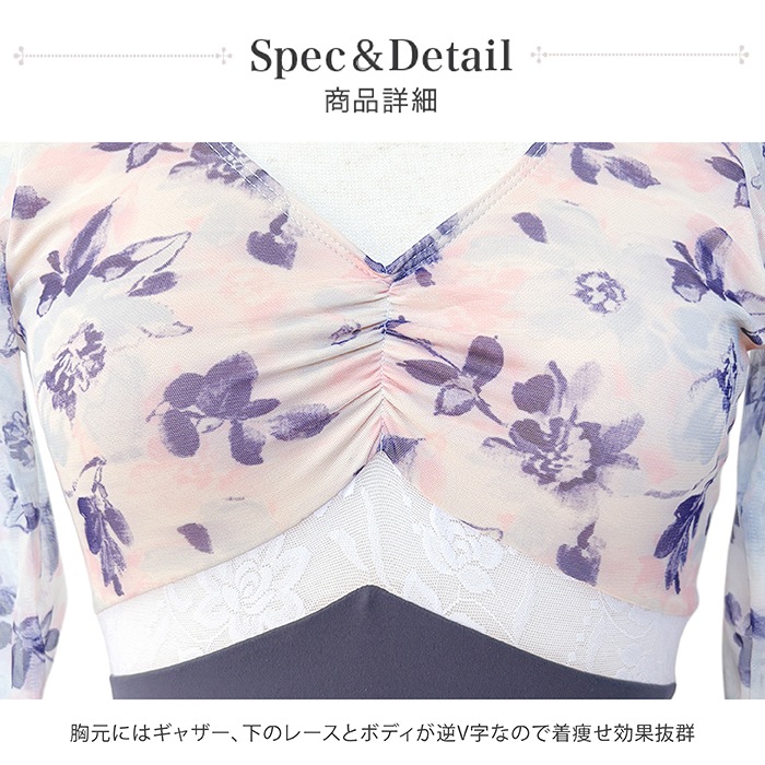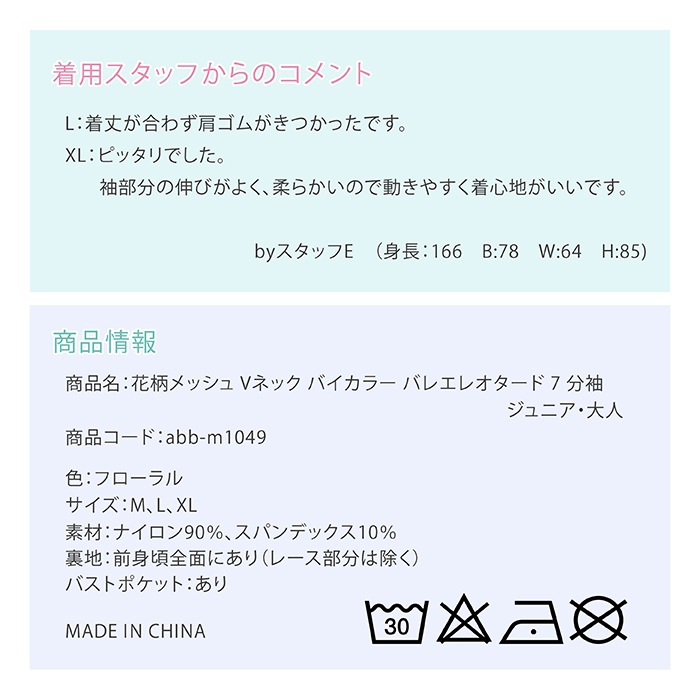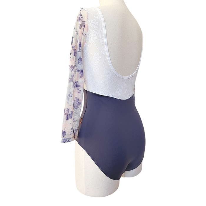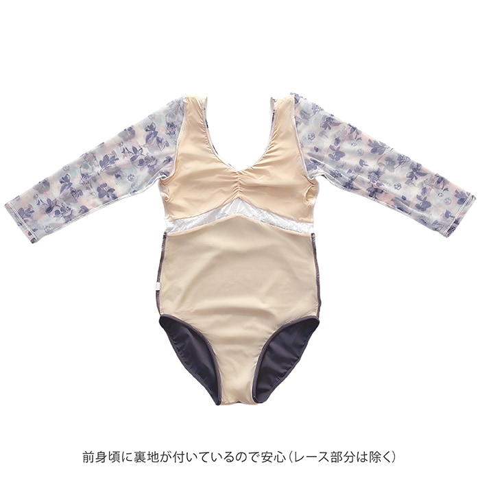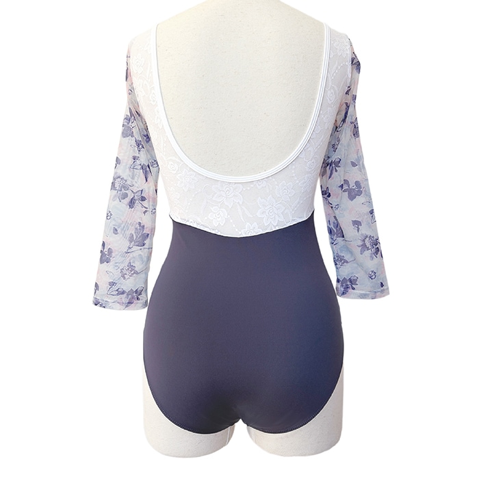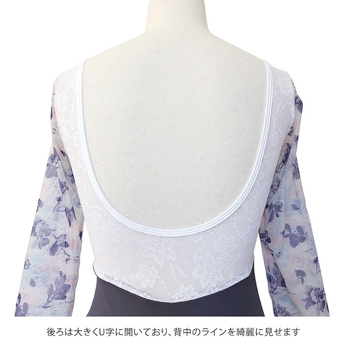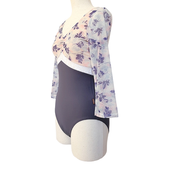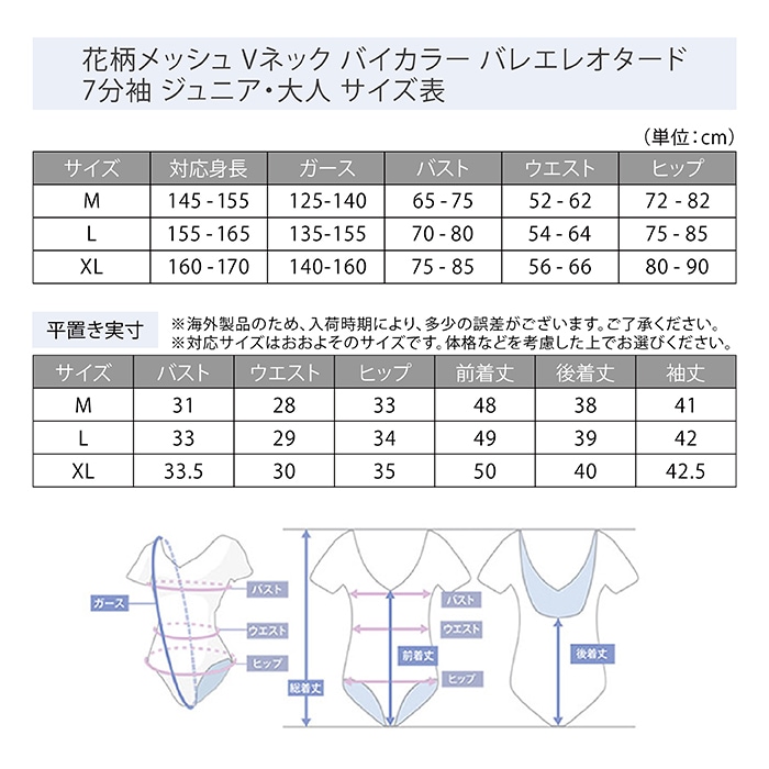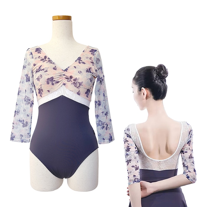 花柄メッシュ Vネック バイカラー バレエレオタード 7分袖 ジュニア・大人 |