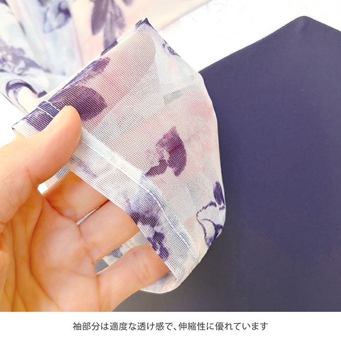 花柄が上品で可愛らしい7分丈の袖は、ストレッチ性が高いメッシュ素材なので動きを妨げません。