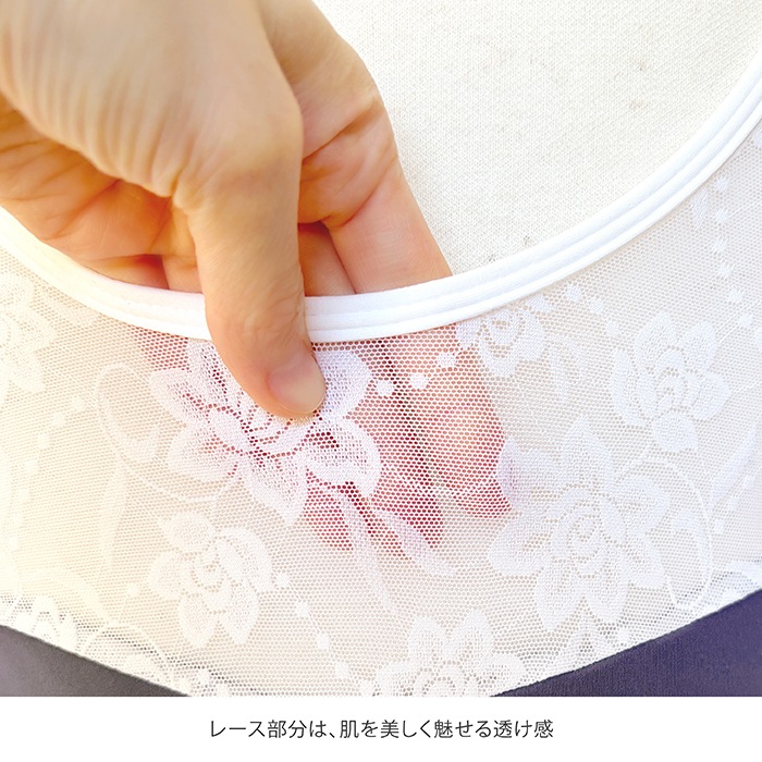 裏地はレース部分を除いた前身頃全面についているので、安心感があります。