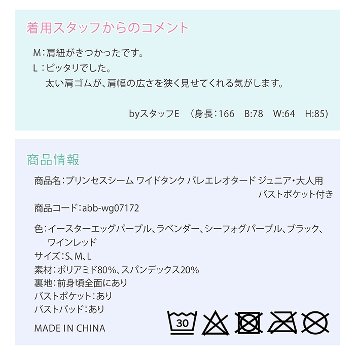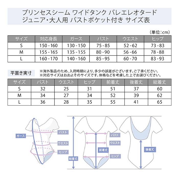 プリンセスシーム ワイドタンク バレエレオタード ジュニア・大人用 バストポケット付き |