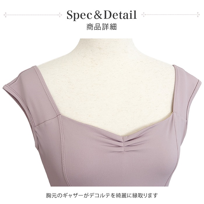 胸元のギャザーにより、まるでハートカットのようなラインでデコルテを綺麗に演出します。