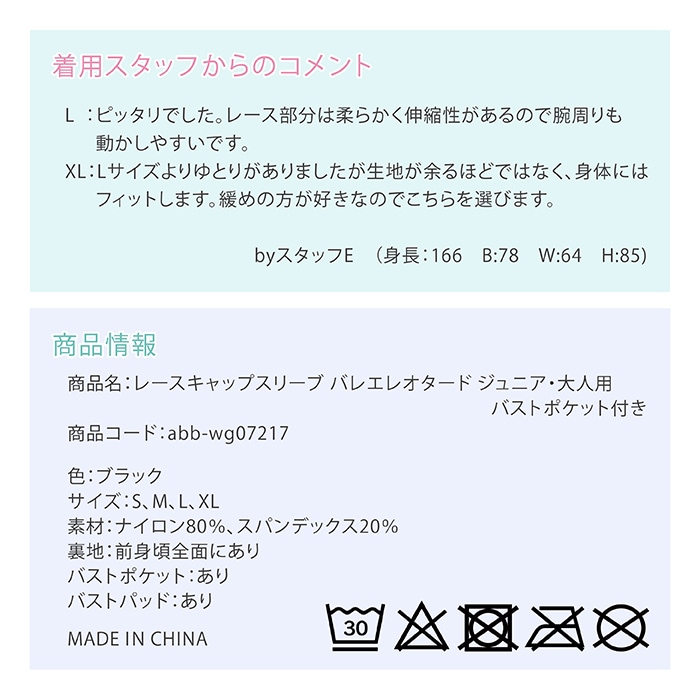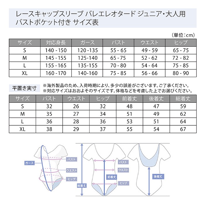 レースキャップスリーブ バレエレオタード ジュニア・大人用 バストポケット付き |
