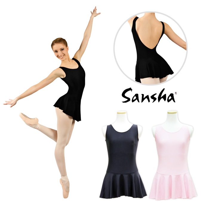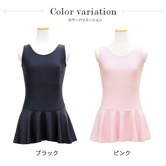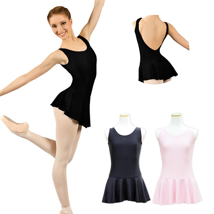 ジュニア&大人サイズのスカート付きスリーブレスレオタードです。