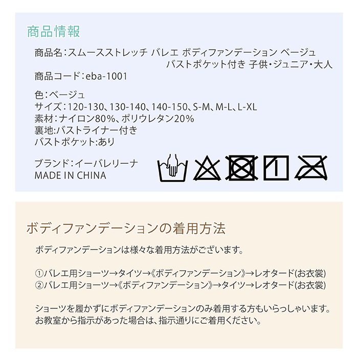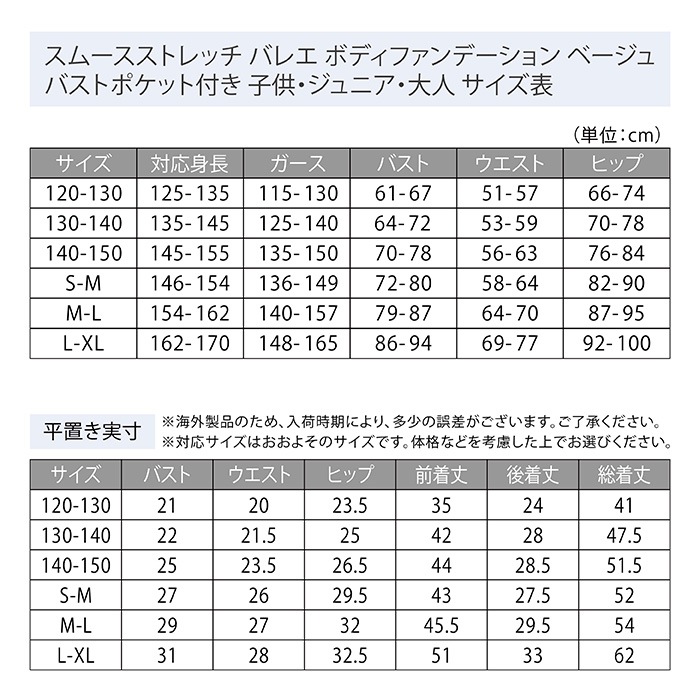 スムースストレッチ バレエ ボディファンデーション ベージュ バストポケット付き 子供・ジュニア・大人