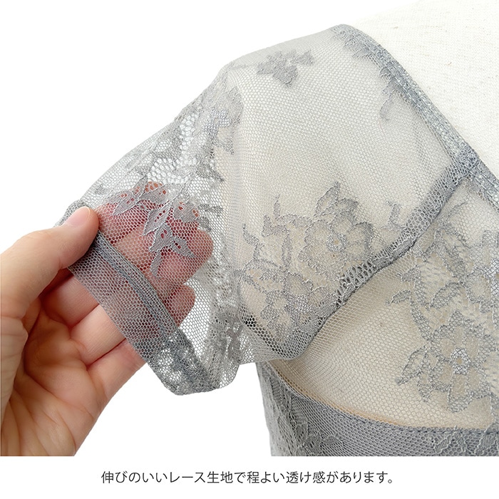アンダーバストから袖、背面にわたりレースで彩られており、レース部分は適度な透け感がありオシャレな一枚です。
