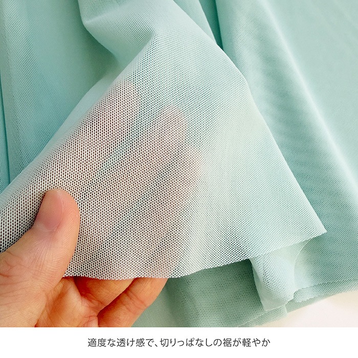 シンプルなフレアタイプで、メッシュ生地の適度な透け感と、切りっぱなしの裾が軽やかな雰囲気です。