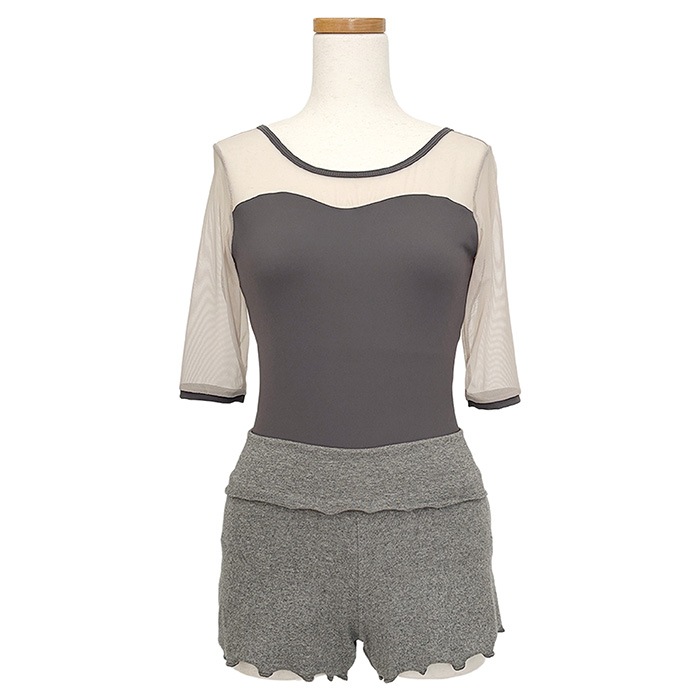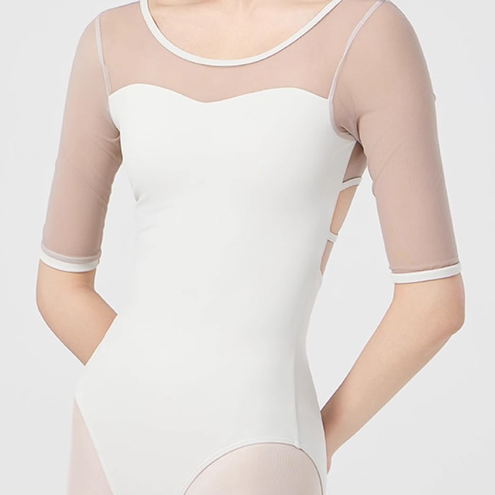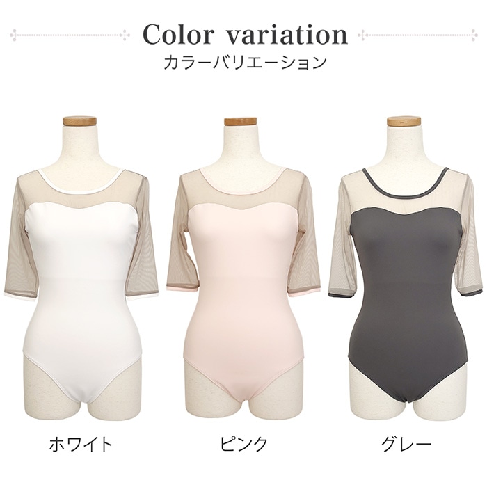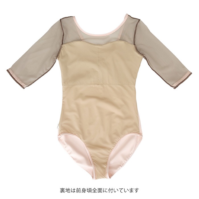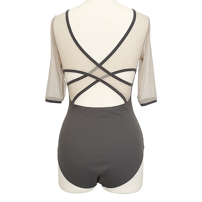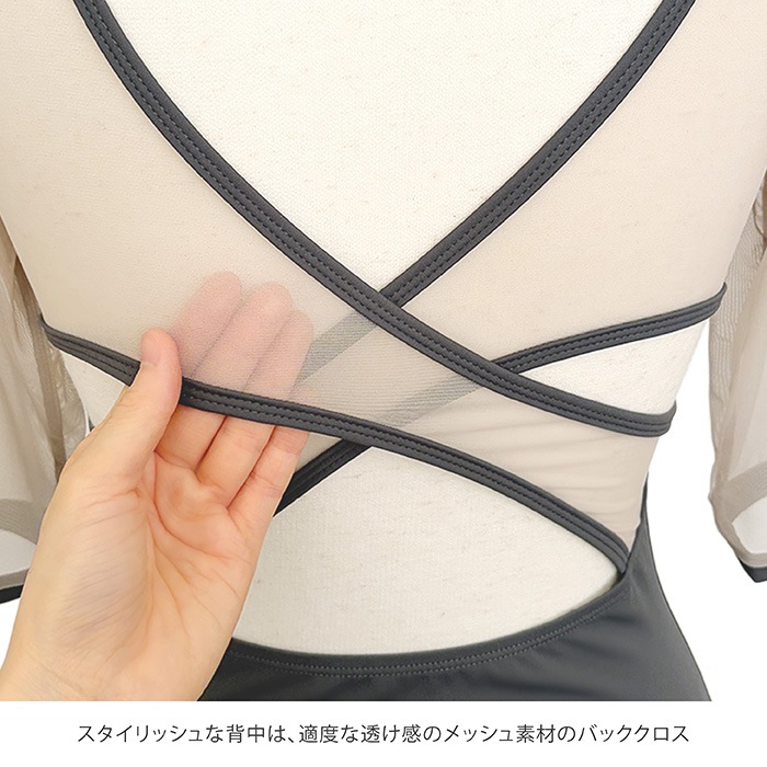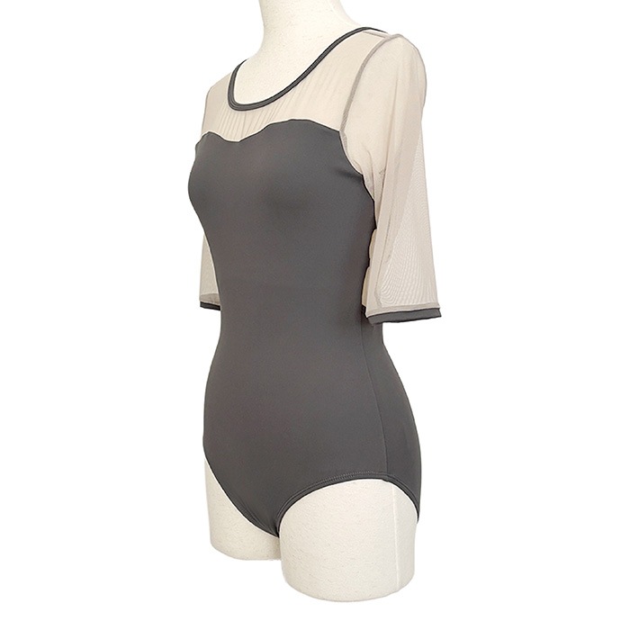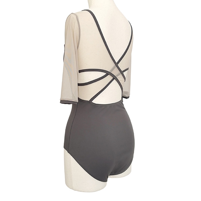 メッシュ素材のバッククロスが美しい、5分袖のレオタードです。
