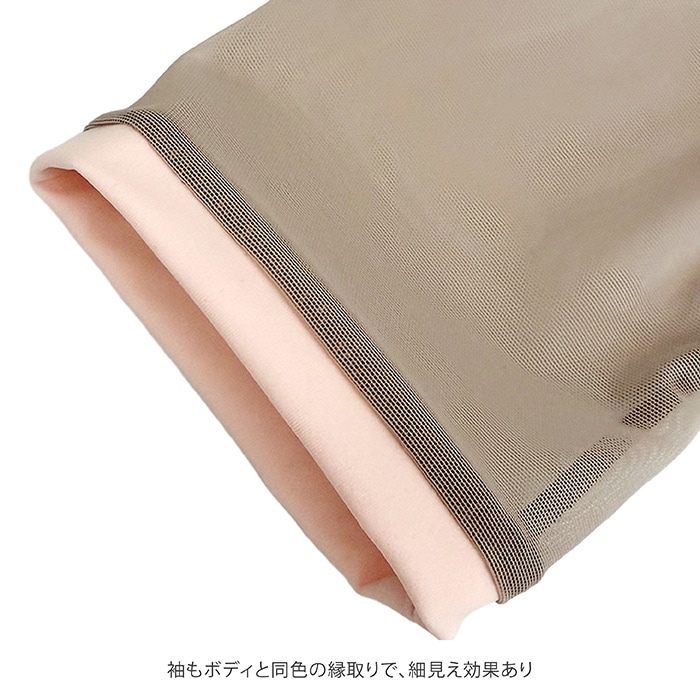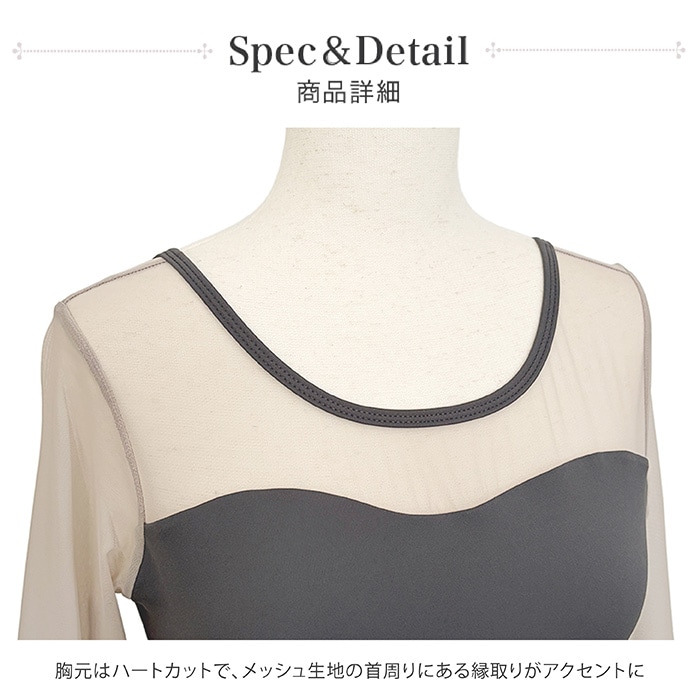ハートカットの胸元に、デコルテから袖・背中までメッシュ素材が施され、適度な透け感が上品なデザインです。