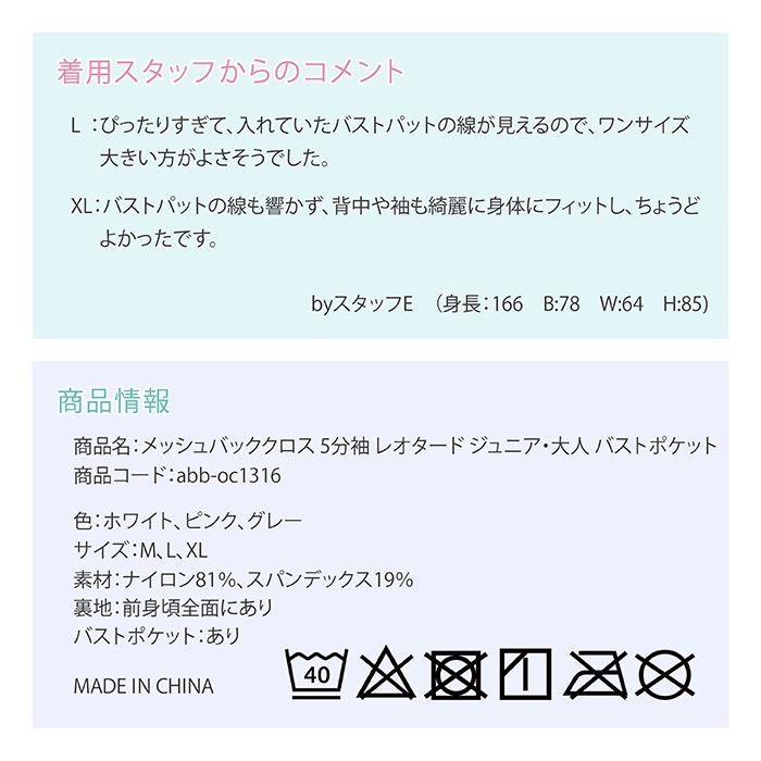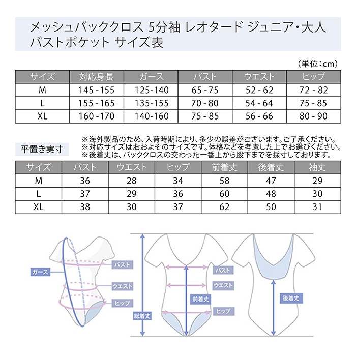 メッシュバッククロス 5分袖 レオタード ジュニア・大人 バストポケット付き |