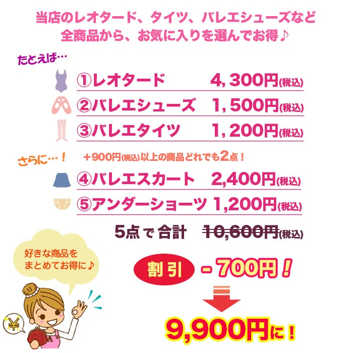 【送料無料】バレエ スターター5点セット【レオタード・シューズ・タイツ+2点で700円引き】★色サイズ交換送料無料! |